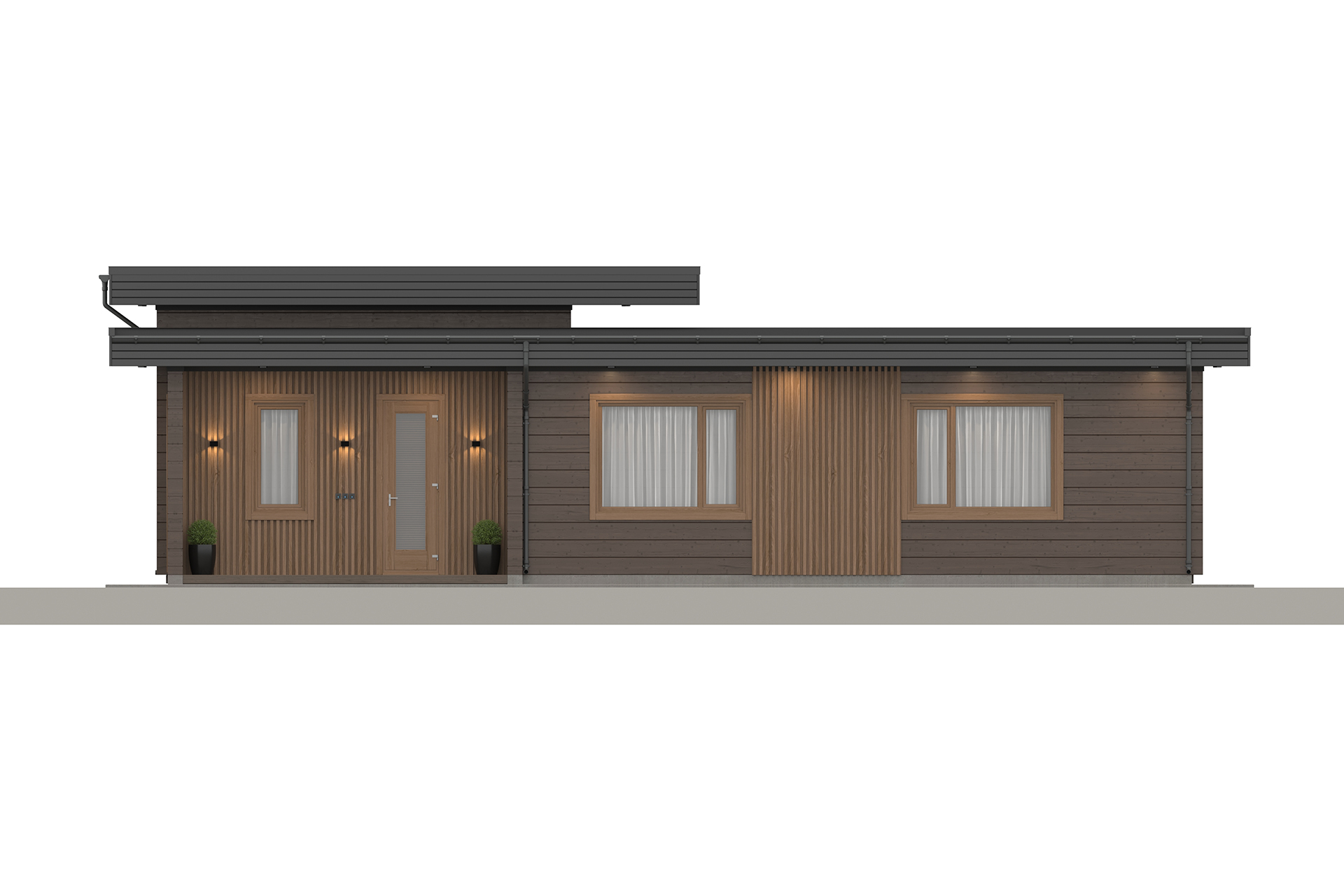 Планировку можно гибко адаптировать: добавить дополнительные комнаты, изменить количество санузлов или предусмотреть сауну - в том числе с панорамным окном и выходом на террасу. Проект легко масштабируется и корректируется под участок и образ жизни семьи, сохраняя главную идею - уютный современный дом с приватной атмосферой.