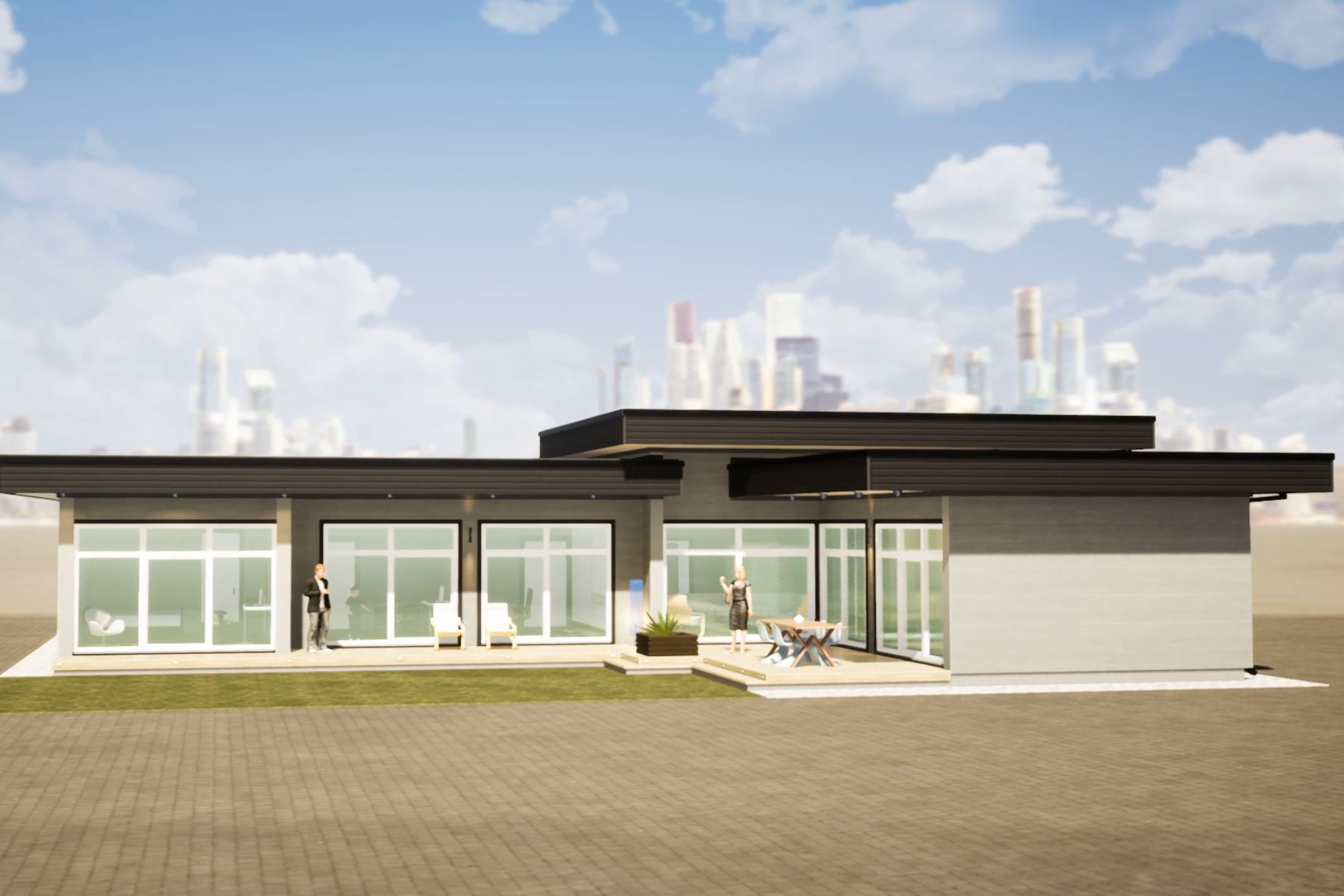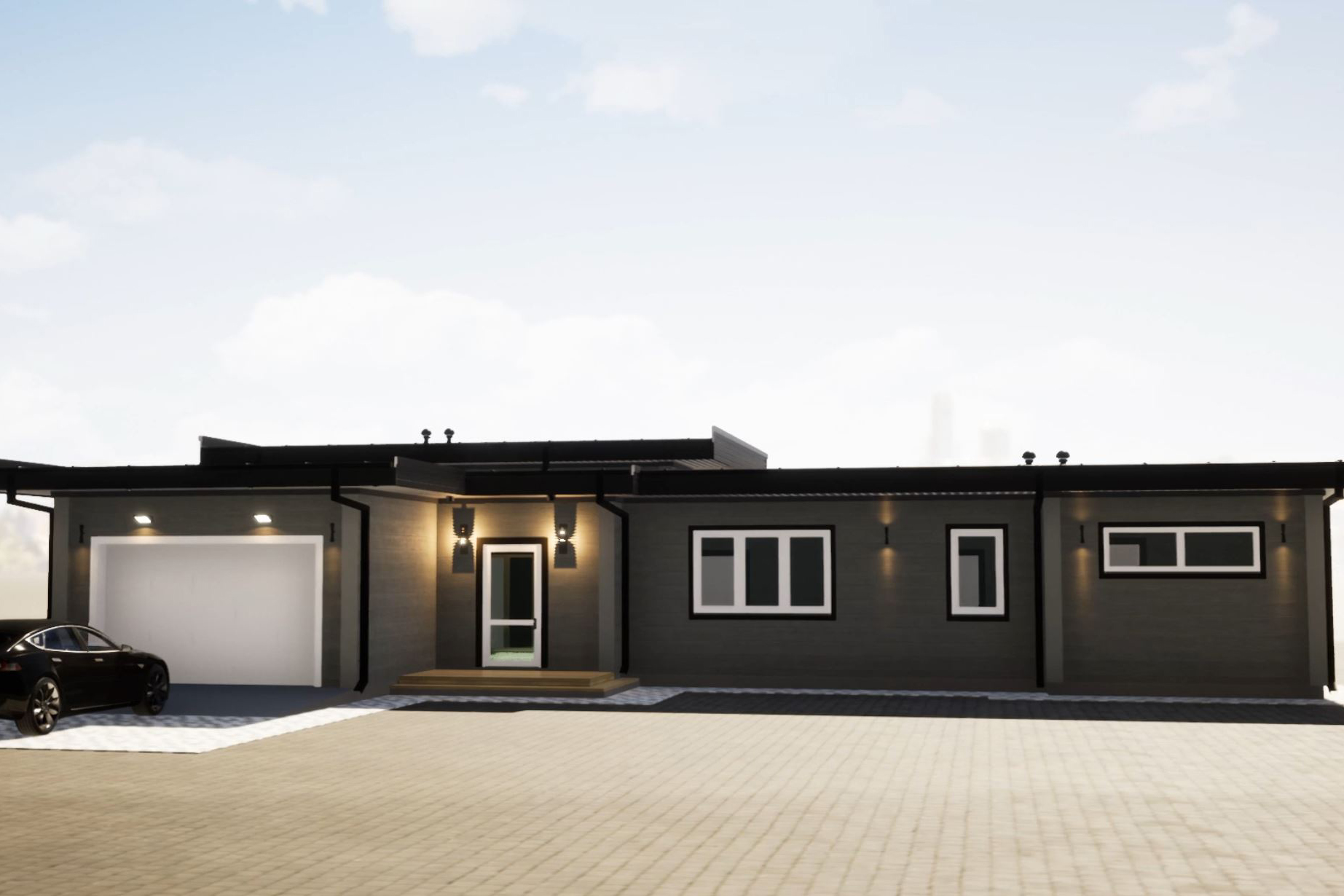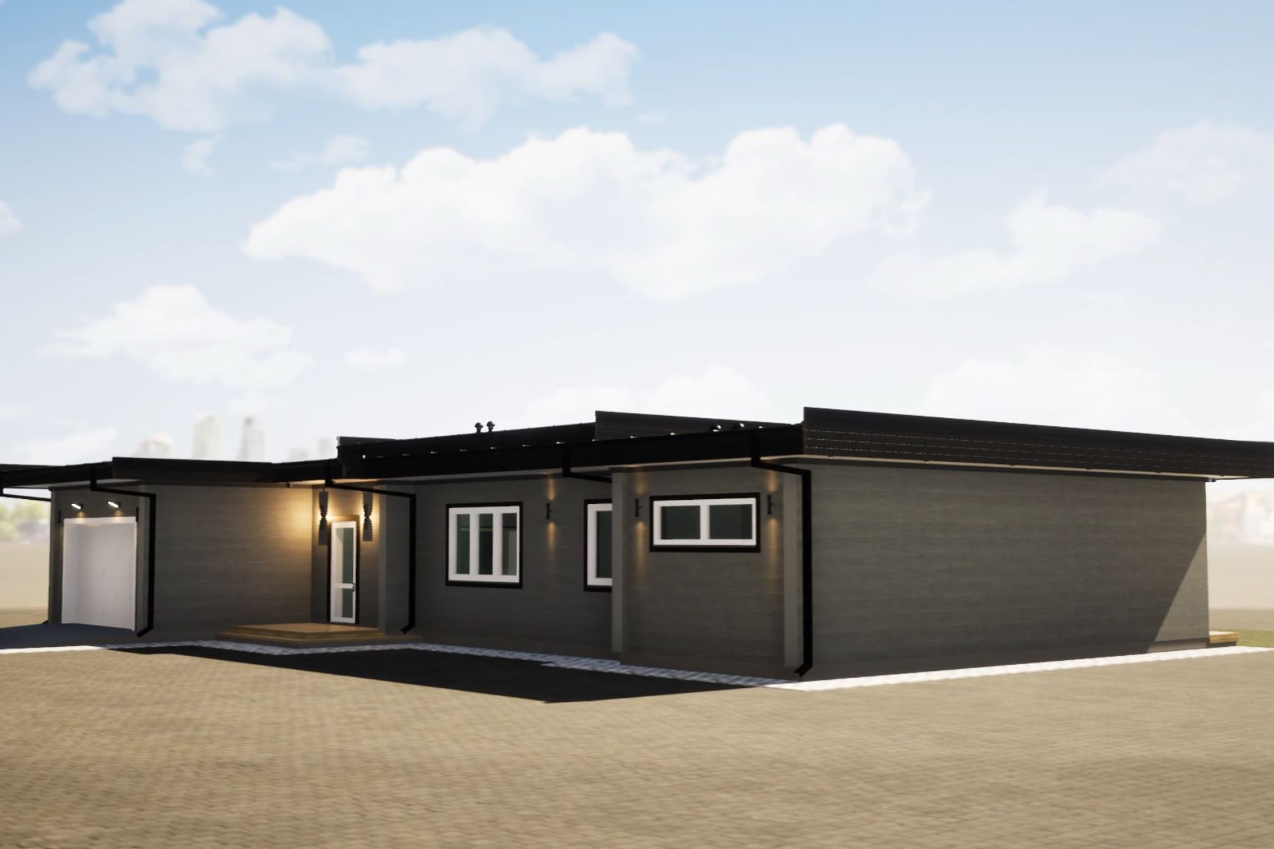 Современный одноэтажный дом площадью 270 м² с плоской кровлей выполнен в Г-образной форме, что обеспечивает приватность участка и позволяет создать уютный внутренний двор, защищённый от соседей. Архитектура дома сочетает лаконичный стиль, чёткие линии и панорамные окна, наполняющие пространство естественным светом. Высота потолков до 4 метров добавляет ощущение свободы и объёма.