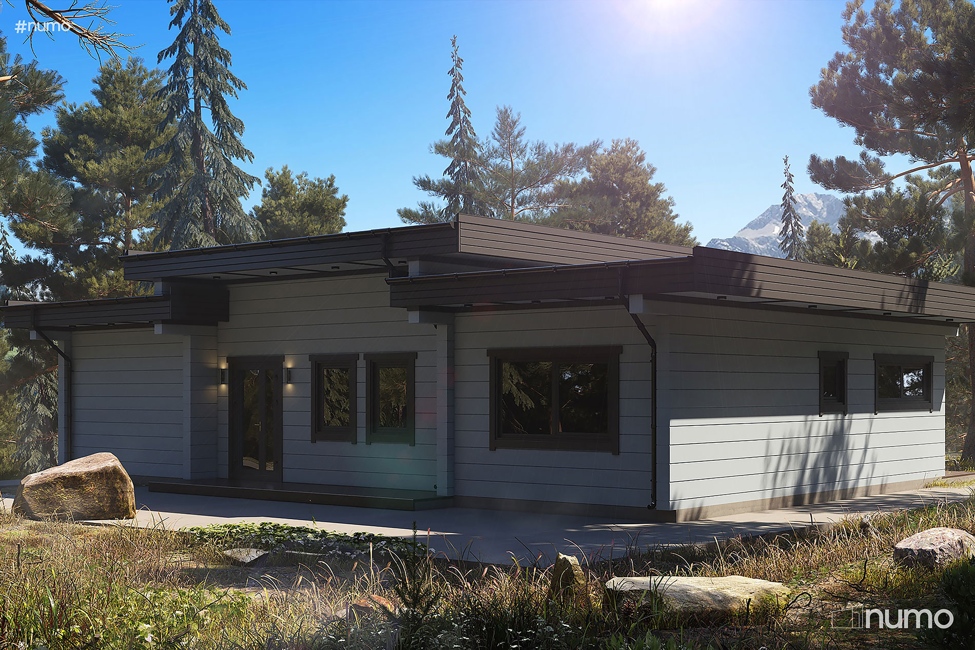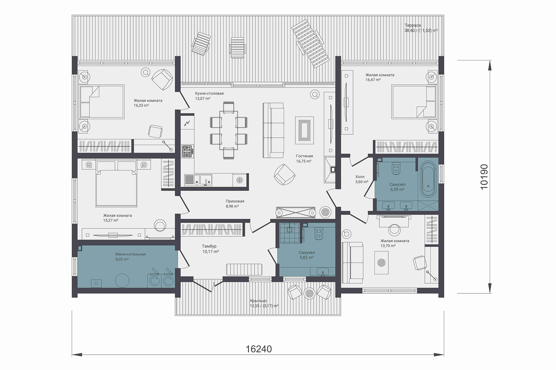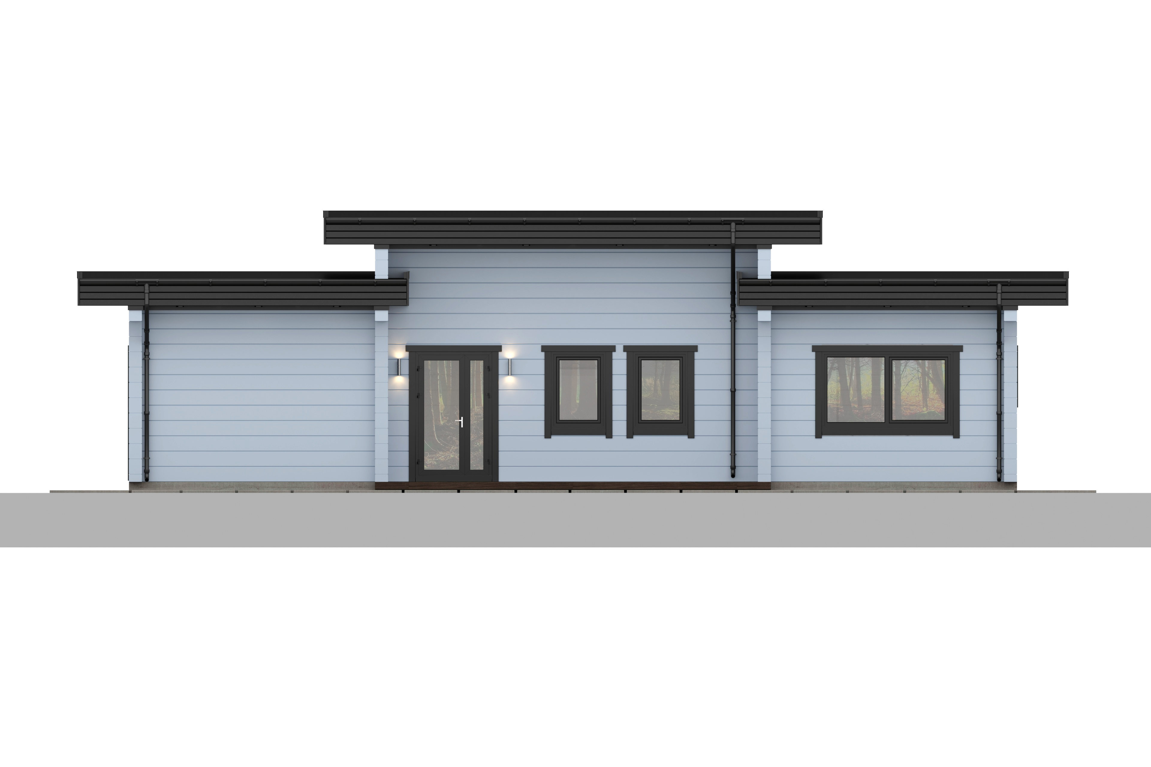 Внутри дома расположены 4 спальни, просторная гостиная, 2 санузла и котельная. Планировку можно адаптировать под потребности семьи из 4–6 человек: объединять или разделять пространства, менять расположение стен, создавать дополнительные функциональные зоны. Гибкая архитектура позволяет проектировать дом под индивидуальные предпочтения и образ жизни.