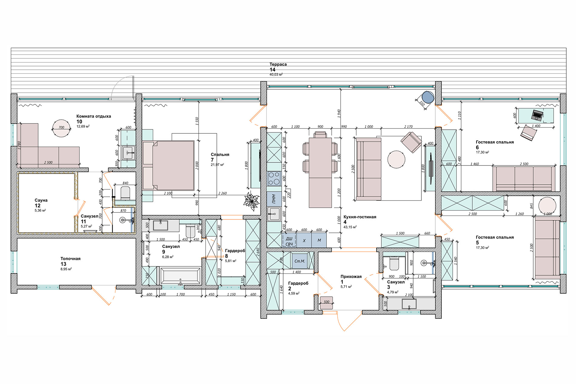 - все помещения с размерами;
