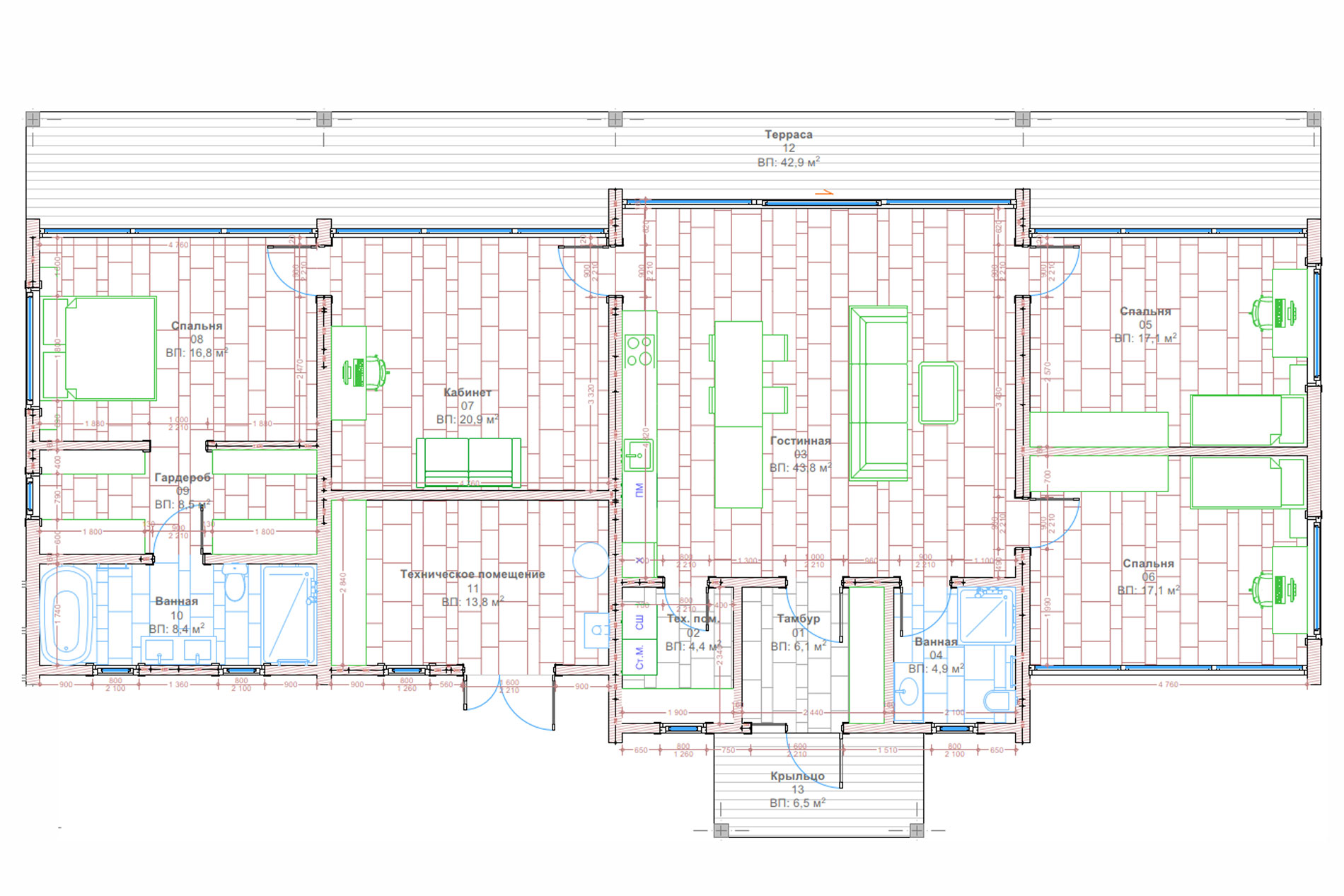 В стоимость дома включены все комплектующие и фурнитура согласно проекту. Это все открывающиеся элементы окон и дверей, раздвижные системы, дверные ручки, элементы замков и другие аксессуары.
