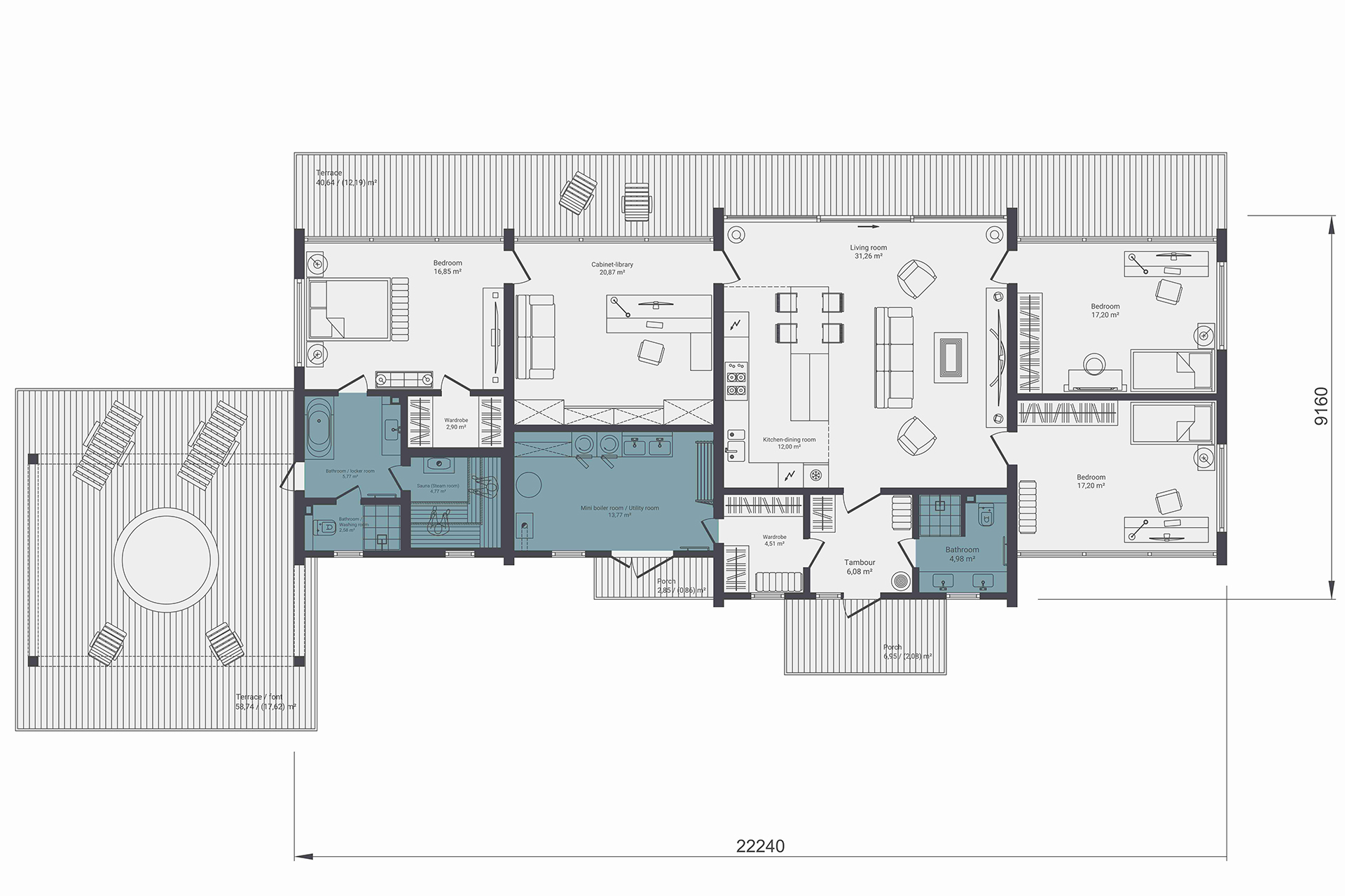 Дополнительный модуль может быть реализован как гостевые комнаты, мастерская, спортивная зона или полноценный банный комплекс. Такое решение позволяет получить индивидуальный дом с расширенной функциональностью, при этом сохраняя современный стиль и возможность адаптации проекта под конкретный участок и образ жизни.