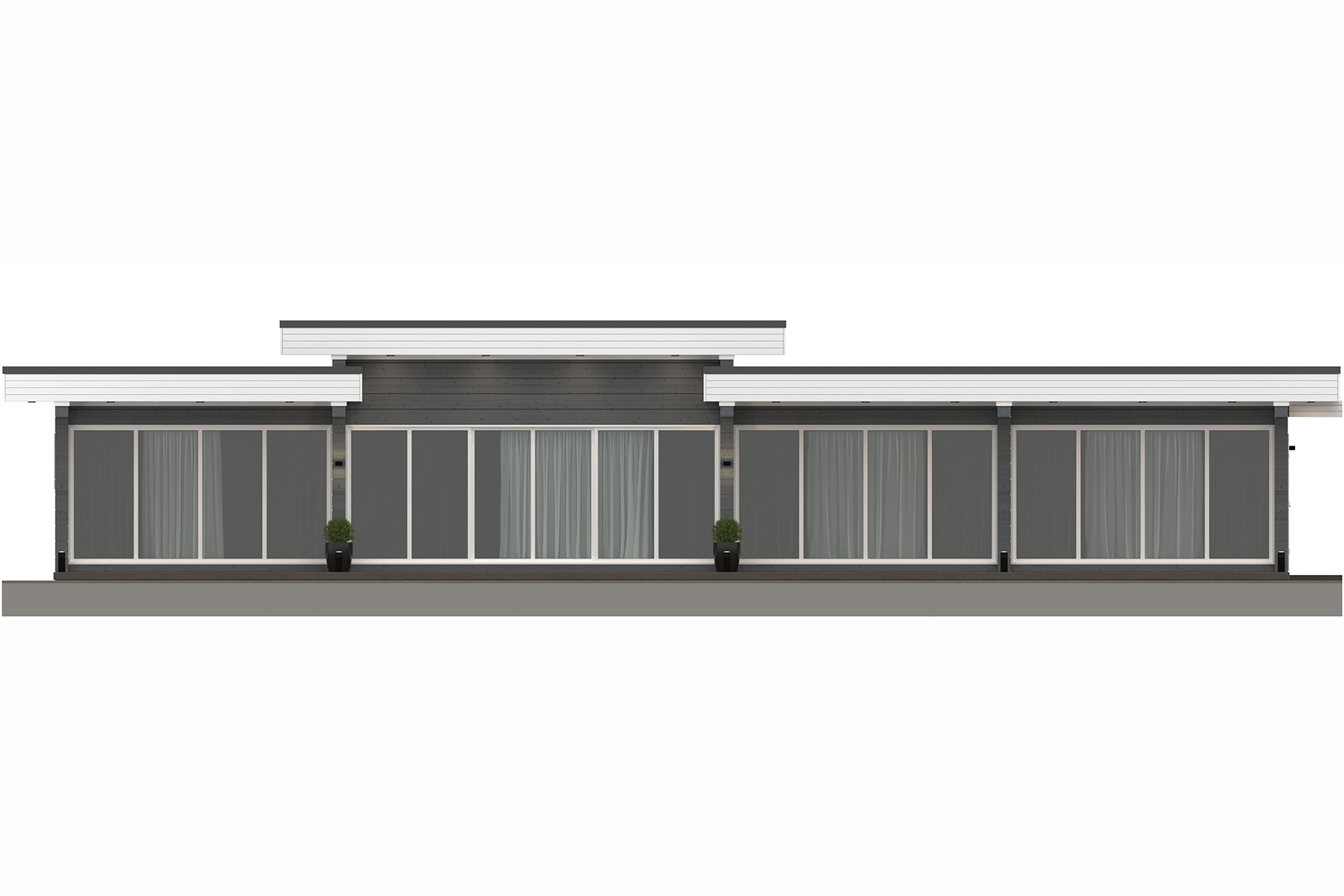 Эта модель дома площадью 182 м² отличается вытянутой архитектурой, что делает её отличным решением для широких участков и локаций с красивыми видами. Все панорамные окна ориентированы в одну сторону - на лес, озеро или другой пейзаж, создавая эффект максимального единения с природой и наполняя интерьер естественным светом.