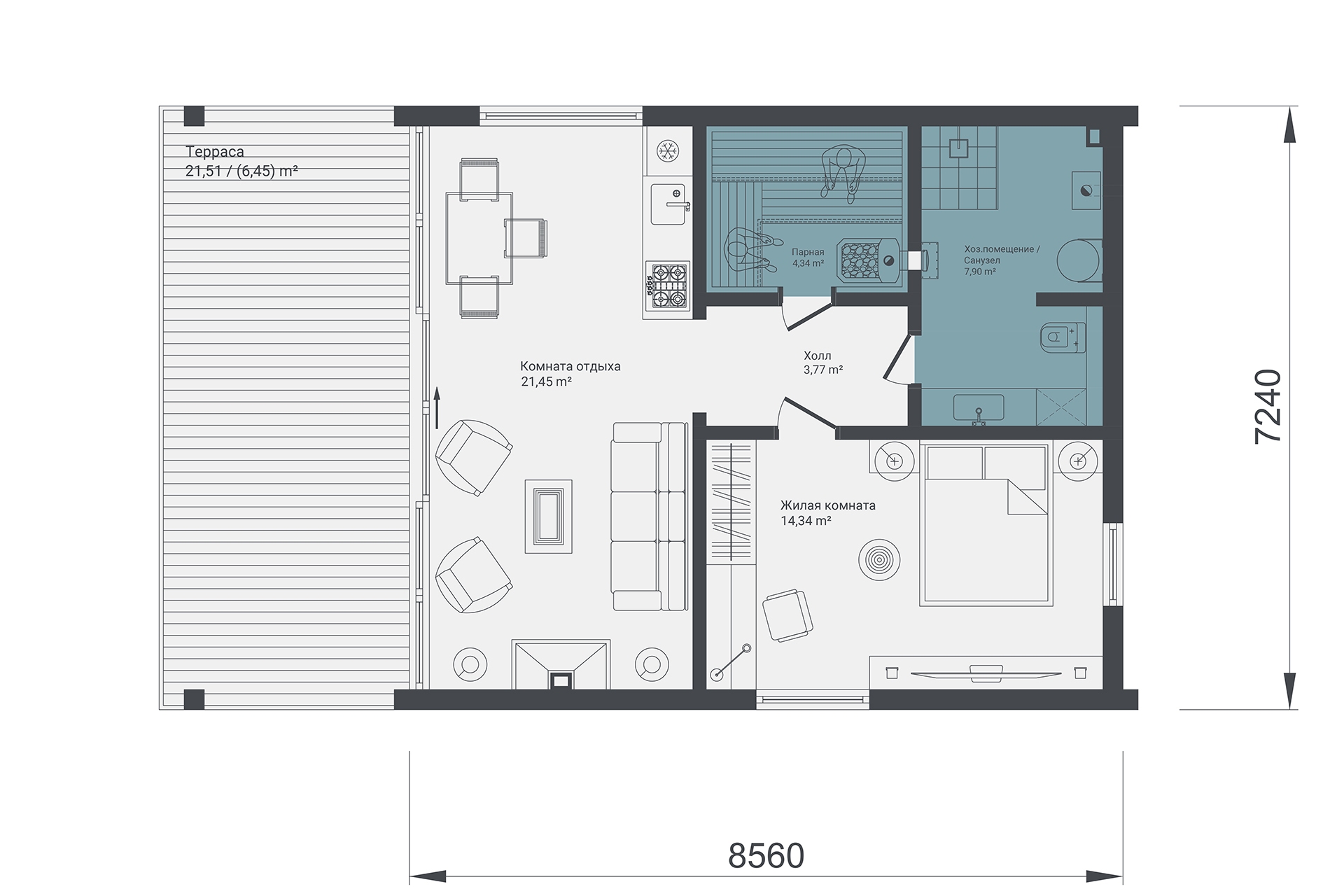 Планировка дома легко адаптируется под разные задачи: баня без комнаты отдыха, гостевой дом, офис, шоу-рум или студия. Возможность индивидуальной компоновки помещений позволяет использовать проект как для частных, так и для коммерческих целей. Дополнительная терраса увеличивает полезное пространство и расширяет сценарии использования дома.