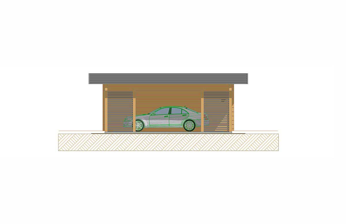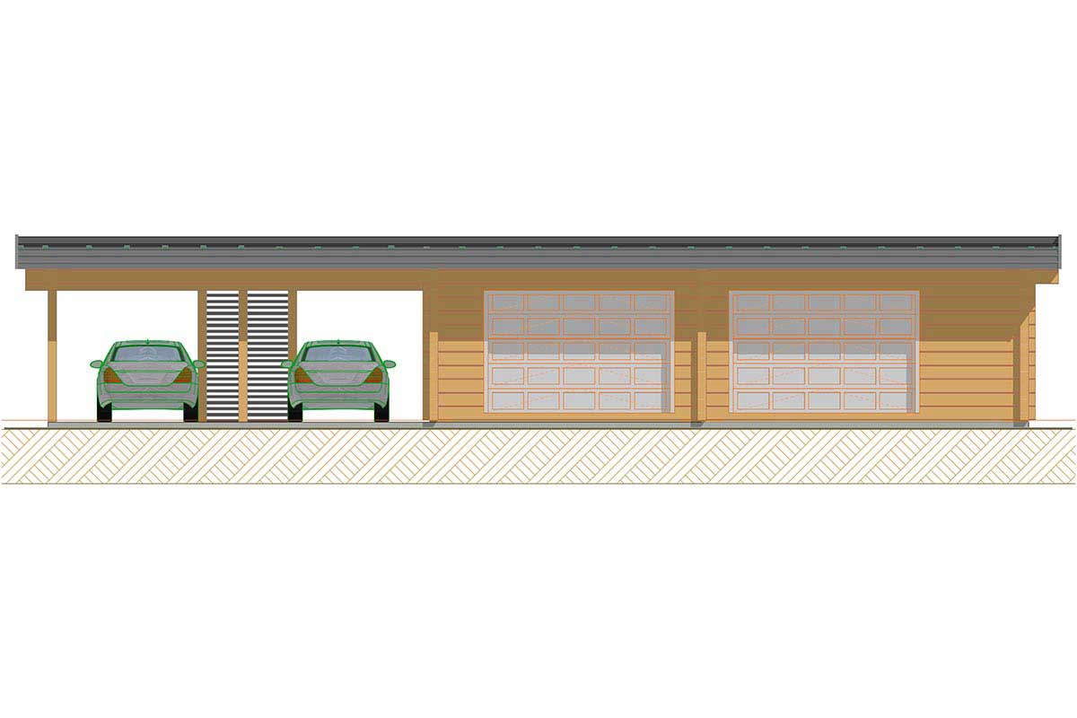 Современный гараж на 4 машины в минималистичном стиле с плоской кровлей сочетает практичность и эстетичность. Проект включает два полноценных закрытых гаражных бокса для безопасного хранения автомобилей, а также два дополнительных парковочных места под навесом, защищённых от осадков. Рационально организованное внутреннее пространство позволяет разместить хозяйственный инвентарь, инструменты и системы хранения.