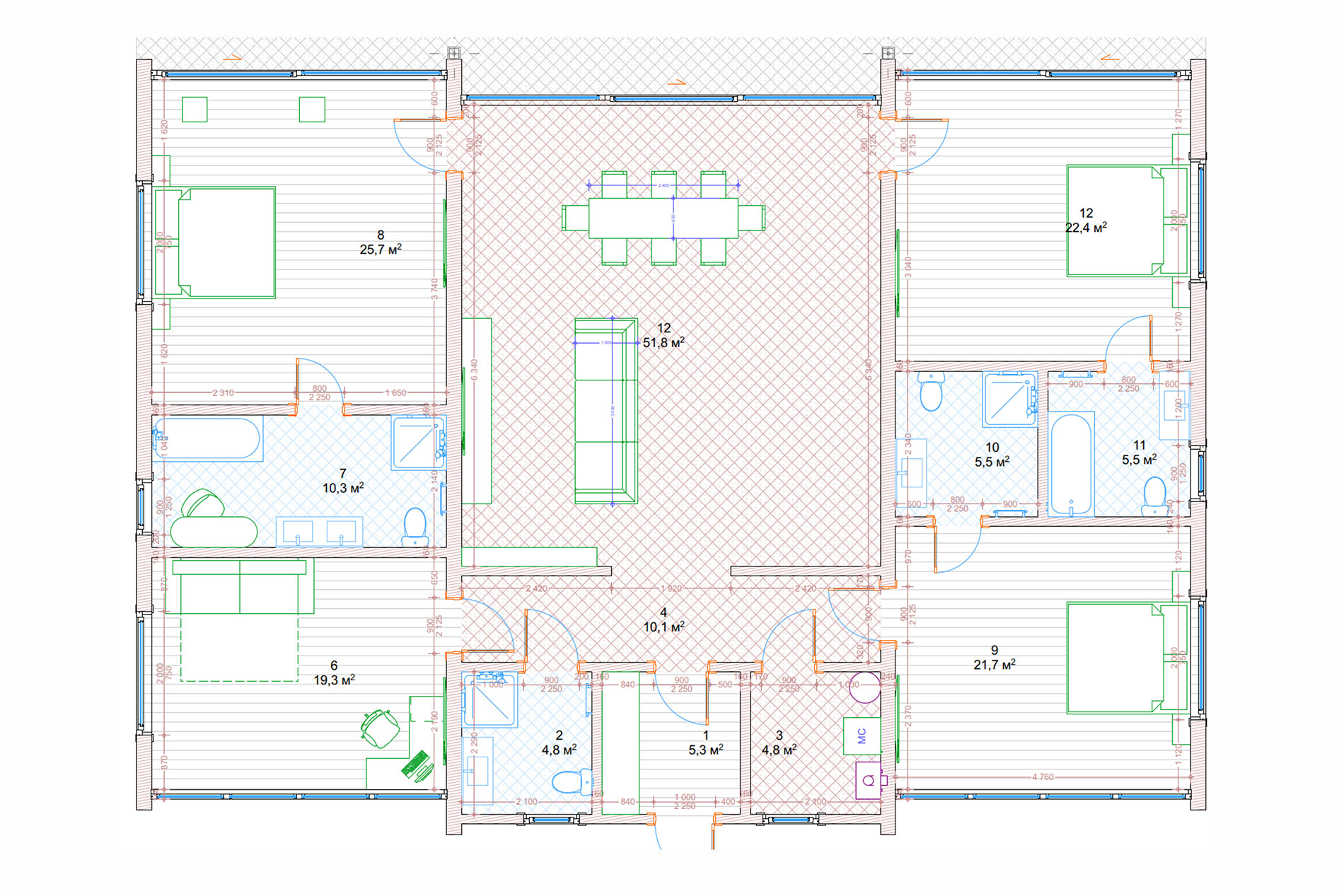 - Планы этажей с привязкой стен и размерами всех элементов;