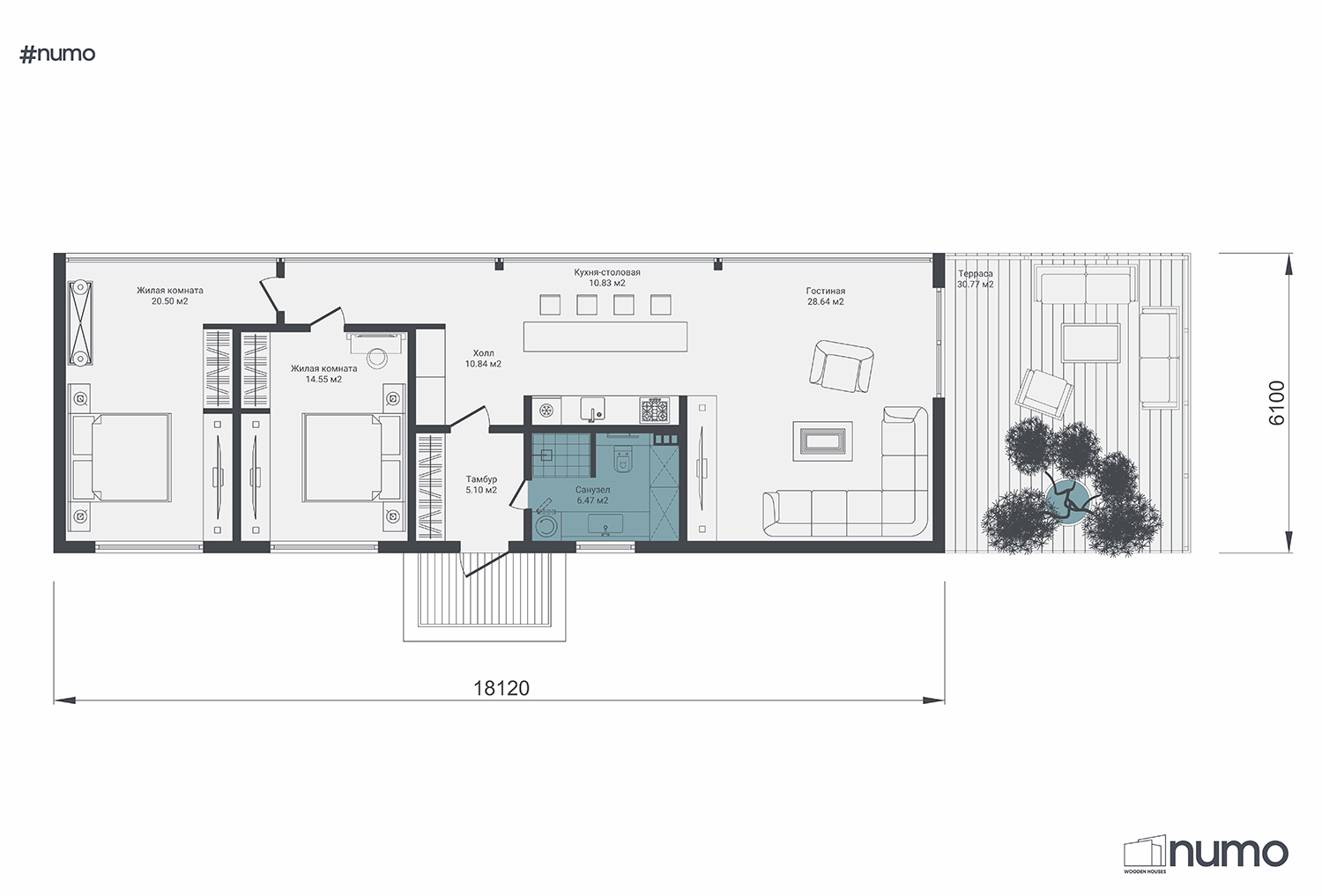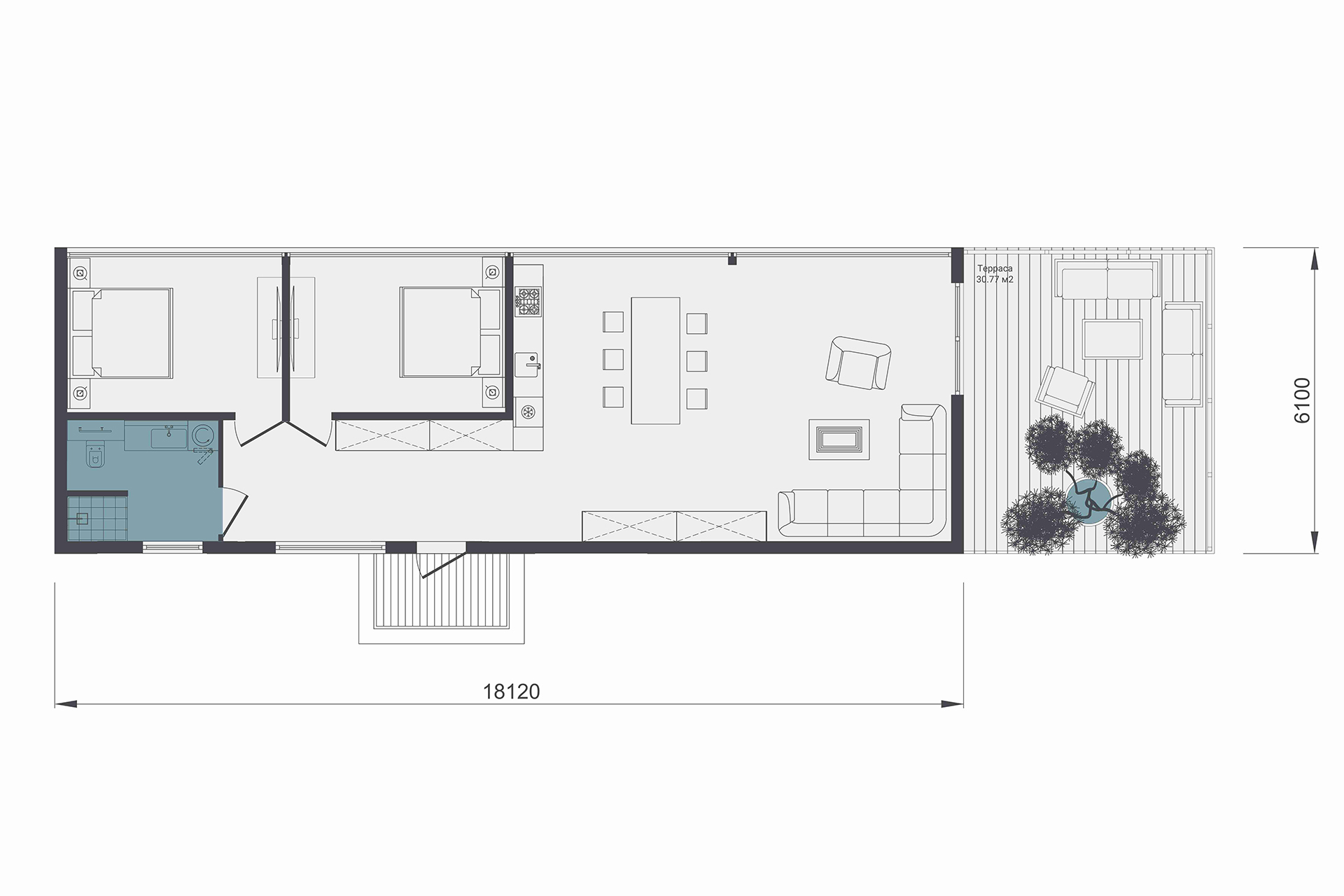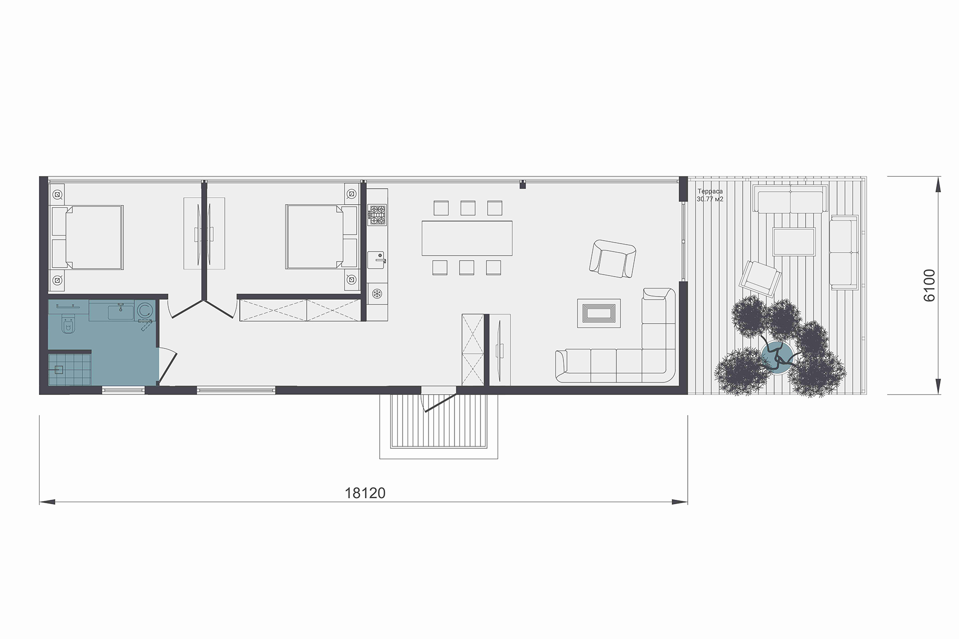 Гибкая и суперуниверсальная планировка позволяет создавать разнообразные внутренние варианты. В доме могут быть две или три спальни, отдельная сауна или объединенное пространство без перегородок. Легкие каркасные стены дают возможность полностью изменять внутренние пространства по желанию, превращая дом в единое открытое пространство или делая его многокомнатным.