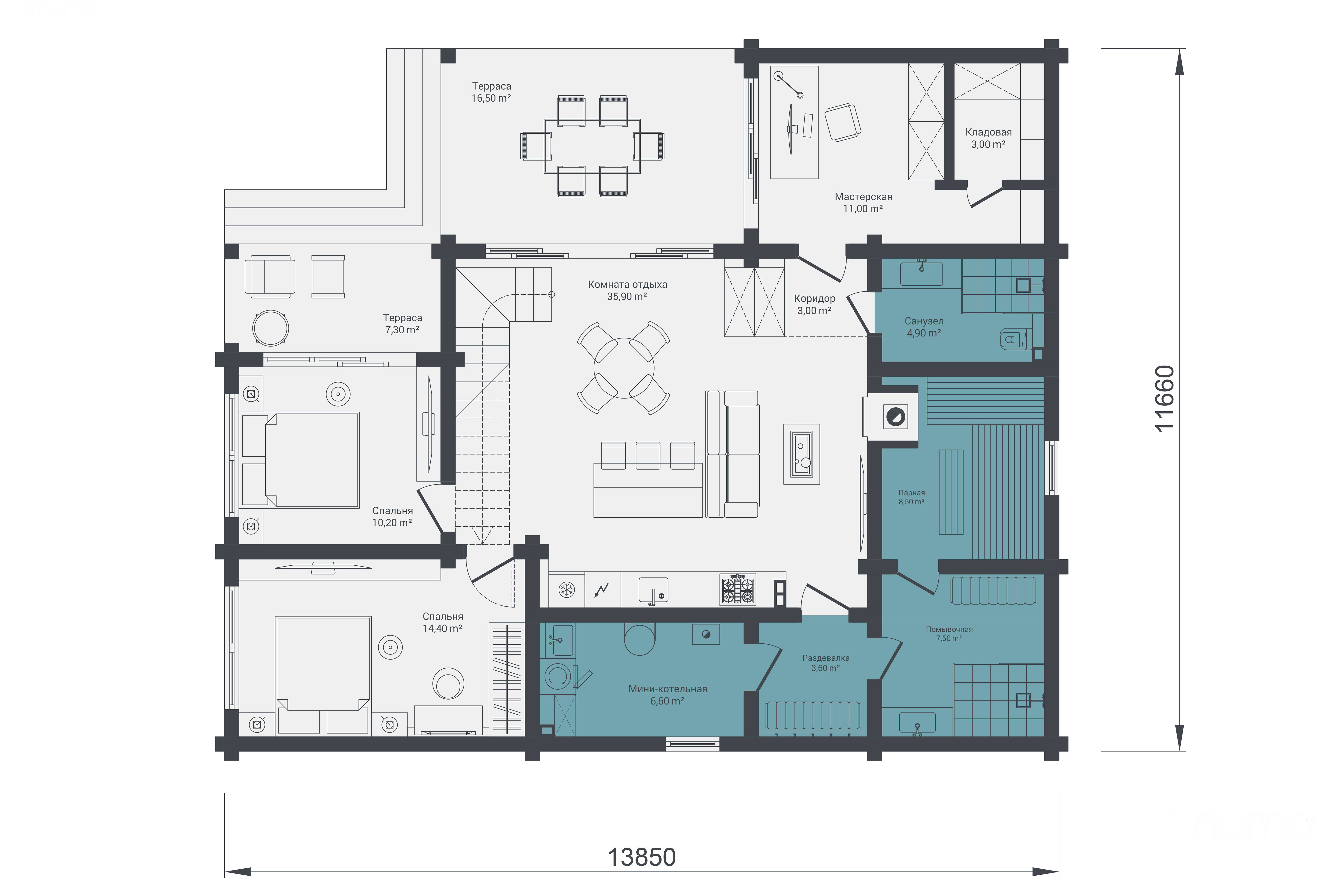 Дом спроектирован с комфортом для семьи из 4–5 человек: четыре спальни, три санузла и собственная сауна обеспечивают приватность и удобство. Продуманная планировка объединяет зоны отдыха, кухни и гостиной, создавая гармоничное пространство для жизни и приёма гостей.